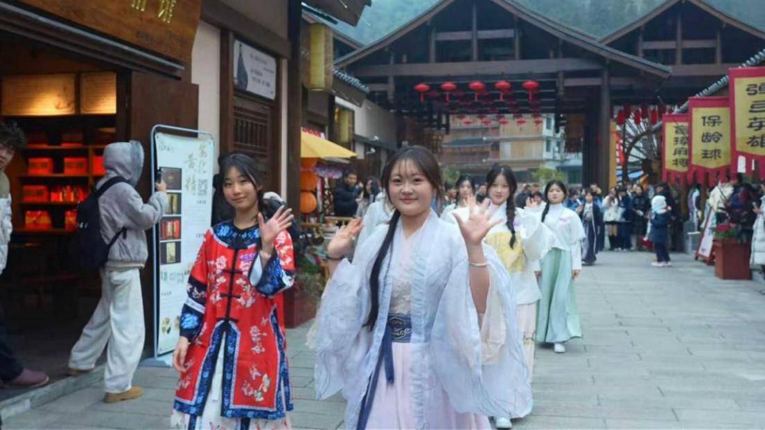 安化茶马古道开展汉服国风巡游活动,40位国风主播同步直播,跨年氛围感一键拉满。景区融合篝火晚会、孔明灯放飞、烟花秀,人气收入同比去年双双大增。